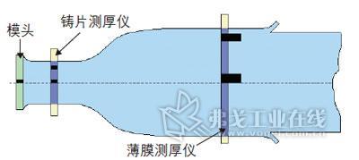 对于双向拉伸薄膜生产线,在线测厚系统一般有两种配置方案:一种是仅在牵引辊站配置薄膜测厚仪。另一种是既在牵引辊站配置薄膜测厚仪,也在激冷辊之后、纵拉入口之前,配备铸片测厚仪。